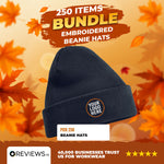 This package includes 100 beanies with a FREE central embroidered logo. What's more, there are NO logo set up fees involved, meaning you can buy in the future with no one-off fees.