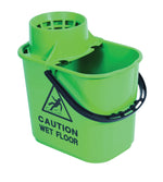 Constructed of robust polypropylene, this mop bucket is strong enough for frequent use when mopping and cleaning. It features a plastic sieve-style wringer for wrenching used water out of your mop, with a channel to carry excess water away to prevent drips. On the side of the bucket, a clear anti-slip warning sign is printed. This pack contains one 15 litre mop bucket with wringer in green, for colour coordinated cleaning.