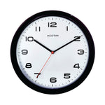 Wall clock with modern design. Numbered white dial. Plastic lens to protect clock face. Precision quartz clock movement. Face diameter 255mm. Requires 1xAA battery (not included). Colour: Black.
