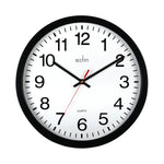 Acctim Controller Wall Clock. Black case with numbered white dial. Precision quartz clock movement. Silent second hand. Face diameter: 368mm. Requires 1xAA battery (not included).