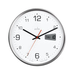 Acctim Kalendar Wall Clock with Digital Date 270mm Diameter Silver Frame 22367. LCD digital date and day display. Glass lens. Non-ticking sweep movement. Two tone hands and glass lens. Requires 2 x AA batteries (not included).