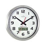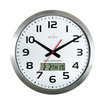 Acctim Meridian Wall Clock. Remote controlled clock for precision timekeeping. Time changes are automatically adjusted. Features digital display showing date and temperature set in a spun aluminium case. (Batteries not supplied). Dia-380mm Depth-50mm.