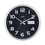 Wall clock with day and date display. Chrome trim with black numbered dial. Domes glass lens. Precision quartz clock movement. Face diameter: 320mm. Requires 1xAA battery (not included). Colour: Chrome/Black.