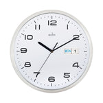 Wall clock with day and date display. Chrome trim with black numbered dial. Domes glass lens. Precision quartz clock movement. Face diameter: 320mm. Requires 1xAA battery (not included). Colour: Chrome/White.