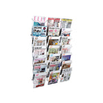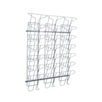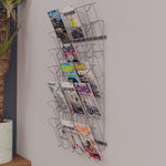 Stylish seven tier (three tiers of seven) wall mounted chrome metal literature holder. Elegant contemporary design. Accepts up to A4 size. Comes with a fixing kit for easy installation.