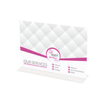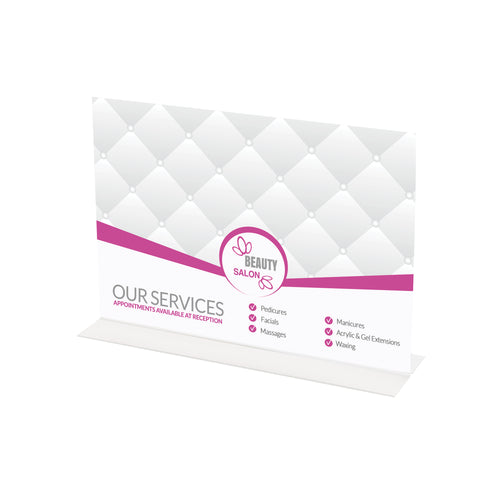 Clear acrylic sign holders displays signs literature product sales sheets etc. Ideal for restaurants retail outlets trade shows etc. Stand-up holders are double sided and load from the bottom. A4 landscape.