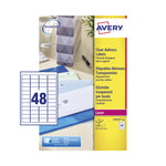 Avery Laser Mini Labels. These labels are transparent, creating the impression that they have been printed on individually. This pack contains 1200 labels with 25 sheets and 48 labels on each sheet. Label size: 22x12mm. Colour: Clear.