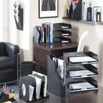 Avery Desk Tidy 88ML. Multi compartment desk tidy with Post It notes holder and assorted sized compartments. Label note holder and scoop trays for convenience. H95 x W260 x D150mm. Black.