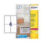 Avery Weatherproof Shipping Label. Made from extremely durable polyester. For use with laser printers on a variety of packing materials. Pack contains 25 A4 sheets, with 4 labels per sheet (100 labels in total). Label size: 99.1x139mm. Colour: White.