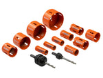12 x Holesaws: 16, 20(x2), 22, 25(x2), 29, 32, 35(x2), 38 and 44mm