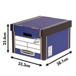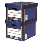 Bankers Box Premium Classic Box Blue (Pack of 5) 7250617. With Presto instant assembly pop-up system. Heavy duty box with two glued layers of carboard to all sides. Reinforced handles. 100% recycled board. Internal dimensions: W330 x D381 x H254mm.