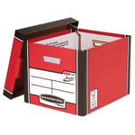 Bankers Box Premium Tall Box Red (Pack of 5) 7260706. With Presto instant assembly pop-up system. Heavy duty box with two glued layers of carboard to all sides. Reinforced handles. 100% recycled board. Internal dimensions: W330 x D381 x H298mm.