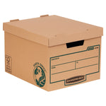 Ideal for long term and archival storage, this environmentally friendly Fellowes Bankers Box is made from 100% recycled board. Double layers of board on the end panels and base provide additional support in, with fold back handles for comfortable carrying. Stackable up to 3 high, this standard storage box measures W375 x D325 x H260mm (internal). This pack contains 10 brown storage boxes.