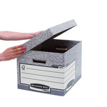 Bankers Box System Storage Box. Fastfold storage box is quick and easy to assemble. Accommodates A4 and Foolscap suspension files. Dimensions (internal): W333xD380xH285mm. Colour - Grey/White.