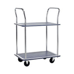 For a robust and professional looking trolley for office and catering use, choose a chrome finish Barton Silver and Blue 2 Shelf Trolley with Chrome Handles. The two shelves are made of pressed steel for exceptional strength and are covered with a non-slip surface to ensure the load remains stable. Scuff-resistant corners mean your trolley will always look presentable. A sleek tubular steel frame not only looks good but also provides a durable support for the shelves, which can hold up to 120kg.