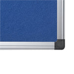 Bi-Office Felt Notice Board. Smart memo board with aluminium trim and fire retardant. Supplied complete with co-ordinating corner caps and wall fixing kit. Size: 1800 x 1200mm. Colour: Blue.