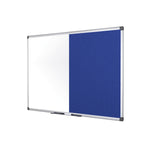 This dual surface Bi-Office board contains both a felt noticeboard for pinning notices, information and notes, and a Magnetic whiteboard for writing, erasing and re-using. With an anodised aluminium frame, this versatile board has a smooth blue felt surface and easy erase whiteboard surface. The board comes supplied with a wall fixing kit, including plastic corners to conceal the fixings once secured. Please note: the felt is fire resistant but the board is not fire resistant.