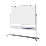 This portable Bi-Office Evolution whiteboard has a double-sided Magnetic surface ideal for training, teaching and presenting. Perfect for frequent and intensive use, the board pivots 360 degrees through the horizontal axis and comes on 4 lockable swivel castors for mobility. The board comes with a fixed accessory tray for pens, magnets, erasers and more. This white board measures 1500 x 1200mm.