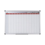 The Bi-Office Magnetic Maya Annual Planner is a versatile and durable tool to organize your schedule, tasks, and events for the year ahead. This planner is designed to be mounted on a wall, making it easily accessible and visible in your workspace or home office. The planners robust aluminium frame gives it a sleek and modern appearance. The printed lacquered steel surface allows you to write and erase as needed, making it a reusable planning tool for years to come. The surface is also magnetic, allowing you to attach notes, memos, and other important documents with ease. The planners 12-month layout is designed for maximum organization, allowing you to plan ahead and stay on top of deadlines and appointments. The months are clearly marked, and there is space for you to write in your daily tasks and events. With its stylish and modern design, this wall planner will look great in any office space.