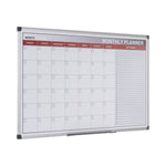 The Bi-Office Maya Magnetic Month Planner is a versatile and durable tool to organize your schedule, tasks, and events for the month ahead. This planner is designed to be mounted on a wall, making it easily accessible and visible in your workspace or home office. The planners robust aluminium frame gives it a sleek and modern appearance. The printed lacquered steel surface allows you to write and erase as needed, making it a reusable planning tool for years to come. The surface is also magnetic, allowing you to attach notes, memos, and other important documents with ease. This useful Month Planner is designed for maximum organization, allowing you to plan ahead and stay on top of deadlines and appointments. The days are clearly marked, and there is space for you to write in your daily tasks and events. With its stylish and modern design, this wall planner will look great in any office space.