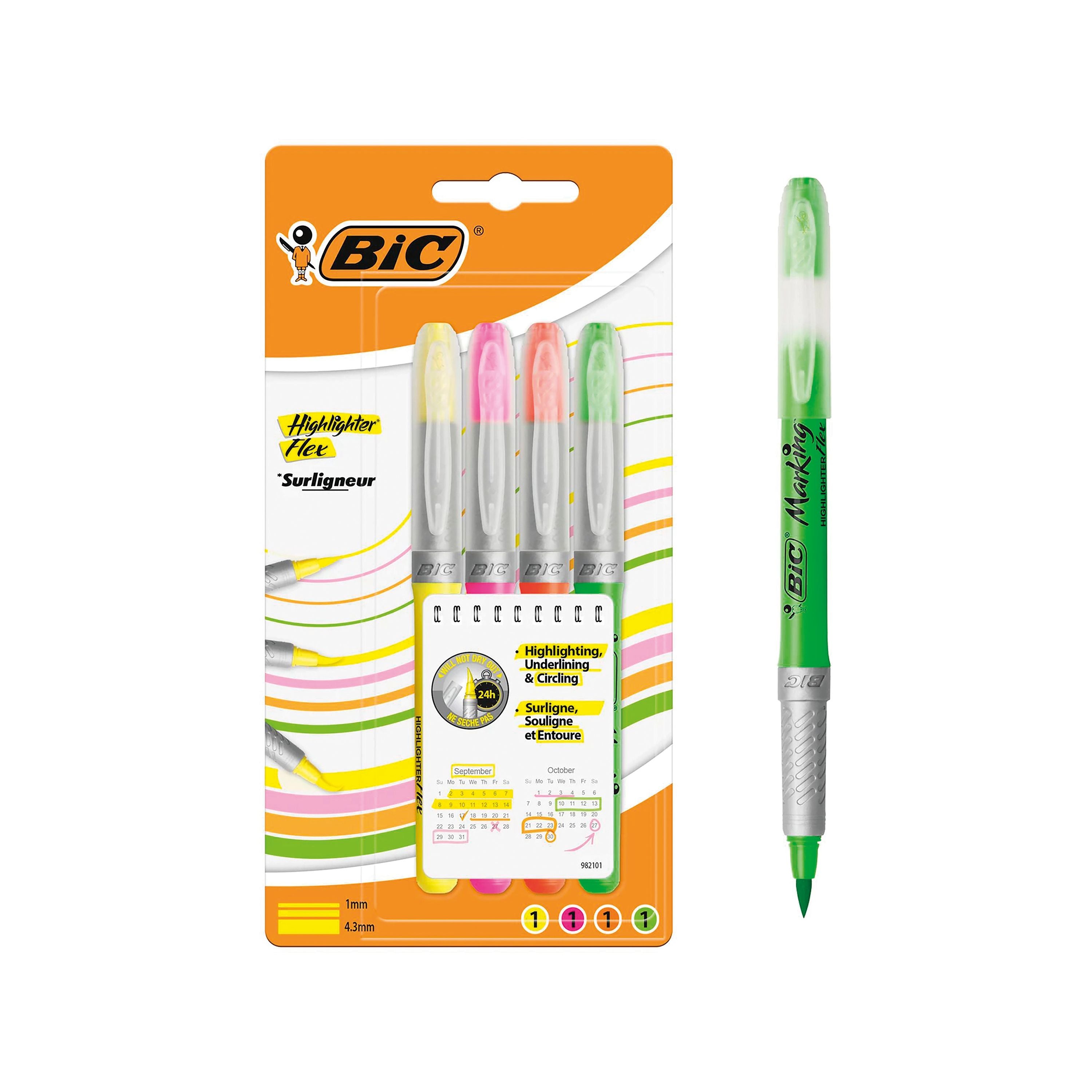 These unique Bic Flex highlighters feature a flexible brush tip, which will produce a fine, medium and a broad line width for versatile use. The pocket sized highlighters can be left uncapped for up to 24 hours without drying out and feature a textured rubber grip for comfortable use. This assorted pack of 4 contains Green, Orange, Pink, and Yellow highlighter pens.