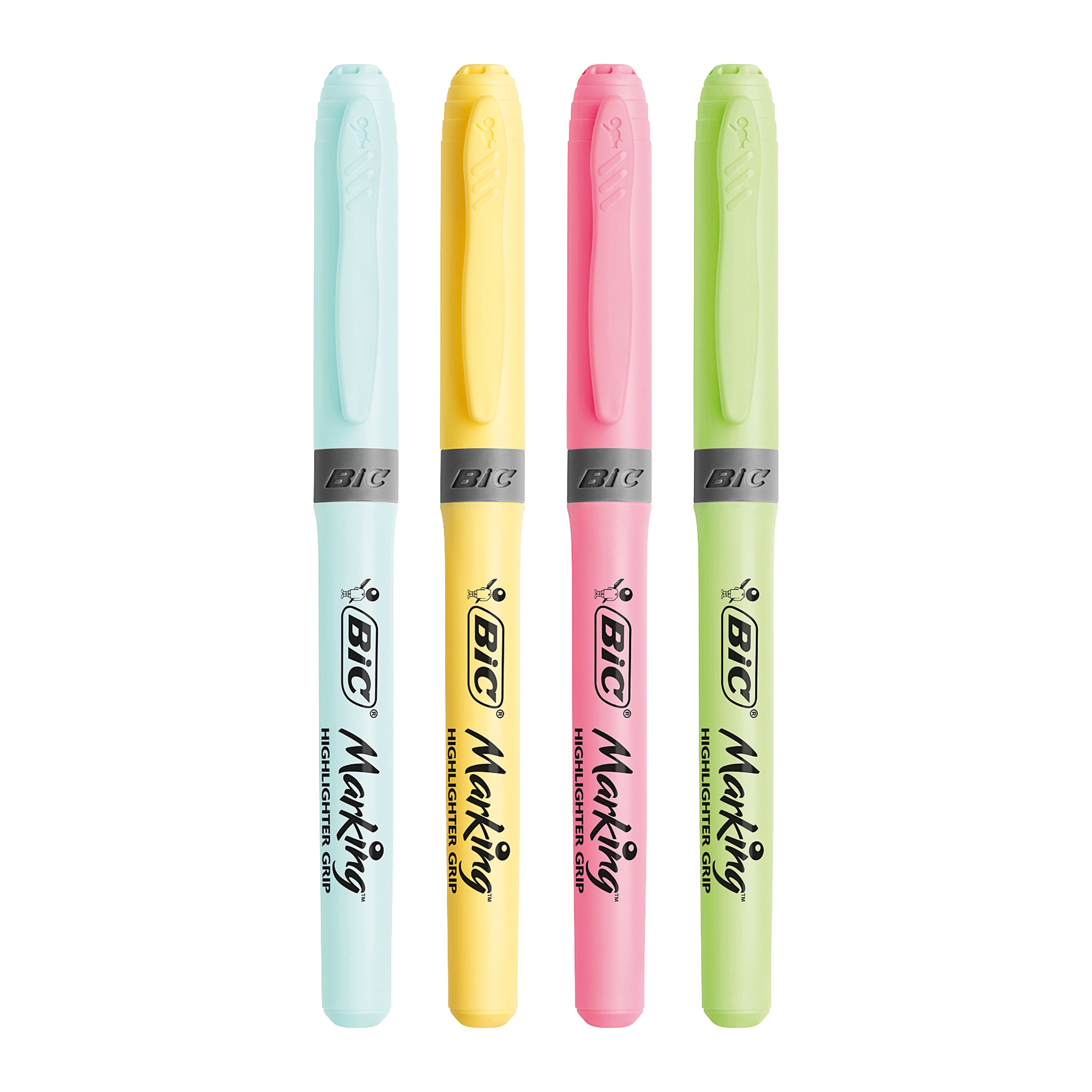 Bic Highlighter Grip Assorted Pastel. Flurorescent water based ink in a vibrant barrel with a comfortable rubber grip. Light colours are ideal for faxes and photocopies. Chisel tip for variable line width. Pack of 4.