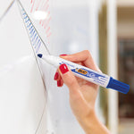 New alcohol based ink formula brings you low odour leaves no marks when wiped out and bright colours. Conical design fits snugly in the hand for better writing control. Blue Pack 12.