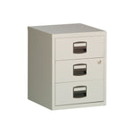 Affordable and spacious, this Bisley Home Filing Cabinet is a great filing cabinet for the home or small office. It features three drawers for A4 document storage and filing, with a single action lock for the bottom 2 drawers to help keep confidential documents secure. The drawers feature ball bearing runners for smooth and effortless movement. Supplied in a grey finish with a mobile design, this cabinet measures 413x400x525mm and has a capacity weight of 15kg per drawer.