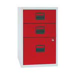 Affordable and spacious, this Bisley Home Filing Cabinet is a great filing cabinet for the home or small office. It features three drawers for A4 document storage and filing, with a single action lock for the bottom 2 drawers to help keep confidential documents secure. The drawers feature ball bearing runners for smooth and effortless movement. This free standing cabinet has a grey carcass with stylish red drawers, measures 413x400x672mm and has a maximum capacity of 15kg.