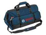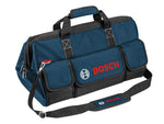 Bosch Professional Tool Bag with multiple pockets for more space and wide opening for easy access. Made from robust 600D polyester. Fitted with strong industrial zippers, and a stable base with robust rails. The tool bag has reflector strips for better visibility.