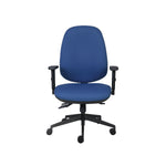 This luxurious and comfortable high back chair offers incredible support and helps to maintain posture. The upholstered, curved back rest and seat are fully adjustable to enable you to find your perfect sitting position. An easy to use gas lift mechanism and black arm rests offer additional support. This blue chair has a recommended usage time of 8 hours.