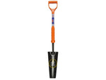 Faithfull Drainage Shovel for working on or near live cables. It has a solid forged steel head and an extra wide €˜YD€™ handle. The insulated shaft has a solid fibreglass core and an abrasive resistant orange polymer coating.