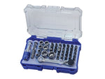 This high quality compact bit and socket set provides a useful addition to any toolkit. The 42 piece set contains a mix of the most commonly used screwdriver bits and popular sizes of ¼in hex sockets. This makes it ideal for a very high proportion of fixing activities across a multitude of trade, leisure, hobby and home applications.