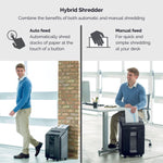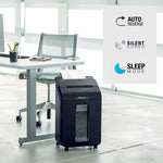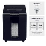 Fellowes AutoMax 100M Hybrid Shredder 4629301. Security level: P4. Mini-cut 4 x 10mm particles are up to 4x smaller than standard cross cut shredders. 100 sheet automatic and a 10 sheet manual shredding capacity. 15 minute run time. 23 litre pull out bin.