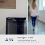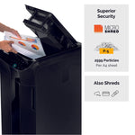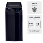 Fellowes AutoMax 600M Micro-Cut Auto Feed Shredder 4657401.Shreds up to 12 sheets of paper into 2x12mm micro-cut particles. Security Level: P-5. Shreds nonstop for up to 10 minutes. Bin Capacity: 83 litres.