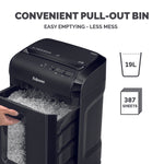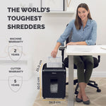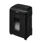 Fellowes 10M Micro-Cut Shredder 4630701. Shreds up to 10 sheets of paper into 2x12mm micro-cut particles. Security Level: P-5. Shreds nonstop for up to 10 minutes. Shreds staples and credit cards. Bin capacity: 9 litres.