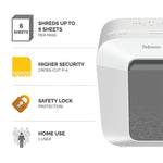 The essential shredder for any home, the LX25 cross-cut paper shredder shreds 6 sheets of A4 paper per pass into 4 x 37 mm cross-cut particles (security level P-4), so you can be sure that your confidential work documents have been disposed of securely. The paper shredders powerful cross-cut cutters will not only shred your documents but can shred staples, paper clips and credit cards too. Designed with safety in mind, the patented Safety Lock prevents your Fellowes cross-cut shredder from accidentally being activated. The LX25 paper shredder will shred continuously for up to 3 minutes before requiring a 30 minute cool down period. Fellowes shredders are built to last with solid steel cutters, a powerful motor and parts that are engineered to outperform our competitors.
