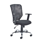 This First Task Chair features a mesh back and fabric seat. It is supplied with height adjustable arms and a chrome base. The lock-tilt mechanism allows you to easily adjust the seating position to what suits you. Recommended usage time: 8 hours. Max weight tolerance: 18 stone. Seat dimensions: W500 x D480mm. Back dimensions: W480 x H570mm. Seat height: 435 - 530mm. Arm height: 630 - 720mm.