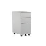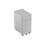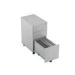 This entry level Jemini mobile steel pedestal features a slimline design for offices with space-saving needs. With 2 stationery drawers and 1 filing drawer, this pedestal is suitable for use with A4 suspension files. The tough steel carcass features an anti-tilt mechanism, allowing only 1 drawer open at a time. This pedestal measures W300xD470xH615mm and comes in a silver finish with an integrated handle design.