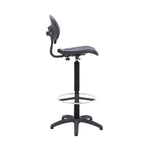 This Jemini draughtsman chair features a durable, ergonomically shaped seat that wipes clean with ease. Ideal for factory, warehouse, laboratory or workshop use, the chair is made from polyurethane material that is both tough and soft, for comfort that can withstand the rigours of heavy duty use. The seat features gas height adjustment from 700mm to 810mm, five swivel castors to allow easy movement but we recommend using the glides provided, and a metal ring footrest for additional comfort.