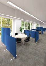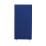 This upholstered floor standing screen is designed to be durable and economic. It is blue with a white trim. It measures W1200 x H1800mm.