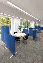 This upholstered floor standing screen is designed to be durable and economic. It is blue with a white trim. It measures W1400 x H1800mm.