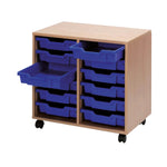 This Jemini Mobile Storage Unit is supplied with 12 blue plastic trays for storage of stationery, files and other office supplies. The strongly constructed carcass has a stylish beech finish and a wipe clean laminate top. The integral castors provide mobility for easy transportation. This unit measures W710 x D495 x H650mm.