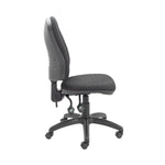 This Jemini Teme Operator Chair has a high back for improved comfort and posture for up to 8 hours at your desk. The back height and angle is adjustable and can be either fixed or free floating. The seat height is also adjustable from 460mm to 590mm. The padded seat and back are upholstered in charcoal fabric and the chair comes on a black plastic 5 castor base (an optional chrome base is available separately).