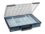 The Raaco A4 Profi Assorter 55 4 x 8-15 is made from a strong polypropylene, with 15 removable inserts and an opaque lid for easy visibility. A grid system ensures inserts remain firmly in place. The assorter is fitted with reliable catches and handle with a close fitting profiled lid for safe transportation of contents.