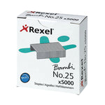 Rexel No. 25 staples are recommended for a variety of Rexel staplers, including the Mini Bambi stapler. With a staple leg length of 4mm and maximum width of 7.2mm, these high quality steel staples can penetrate up to 10 sheets of 80gsm paper. This pack contains 5,000 staples.