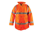 Scan High-Visibility Orange Waterproof Motorway Jacket with taped seams and retro-reflective tape. It has a quilted nylon lining, a two-way heavy-duty zip fastening, stud fastening storm flap, concealed hood with drawstring and is 100% polyester with PVC coating. Offers excellent protection against adverse weather conditions.