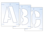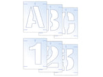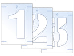 The stencils have letters and/or numbers with identical heights, with varying widths per individual character. The spacer marks in the corners of the stencils allow the user to accurately line up the next character in sequence, ensuring neatness.