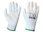 Scan White PU Coated Gloves offer lightweight protection with a slightly enhanced gripping power. The 13 gauge polyester liner provides added warmth. The palm has been dipped in polyurethane. Seamless design with a knitted wrist.
