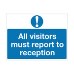 This sign is designed to inform and instruct all visitors arriving on your site that they need to report to reception. The universal symbol and blue and white colour scheme instantly categorises this as a mandatory sign on sight, keeping employees, customers and visitors informed and safe. The durable PVC sign is easily fixed to a variety of surfaces and is suitable for both indoor and outdoor use. This sign measures 450x600mm.